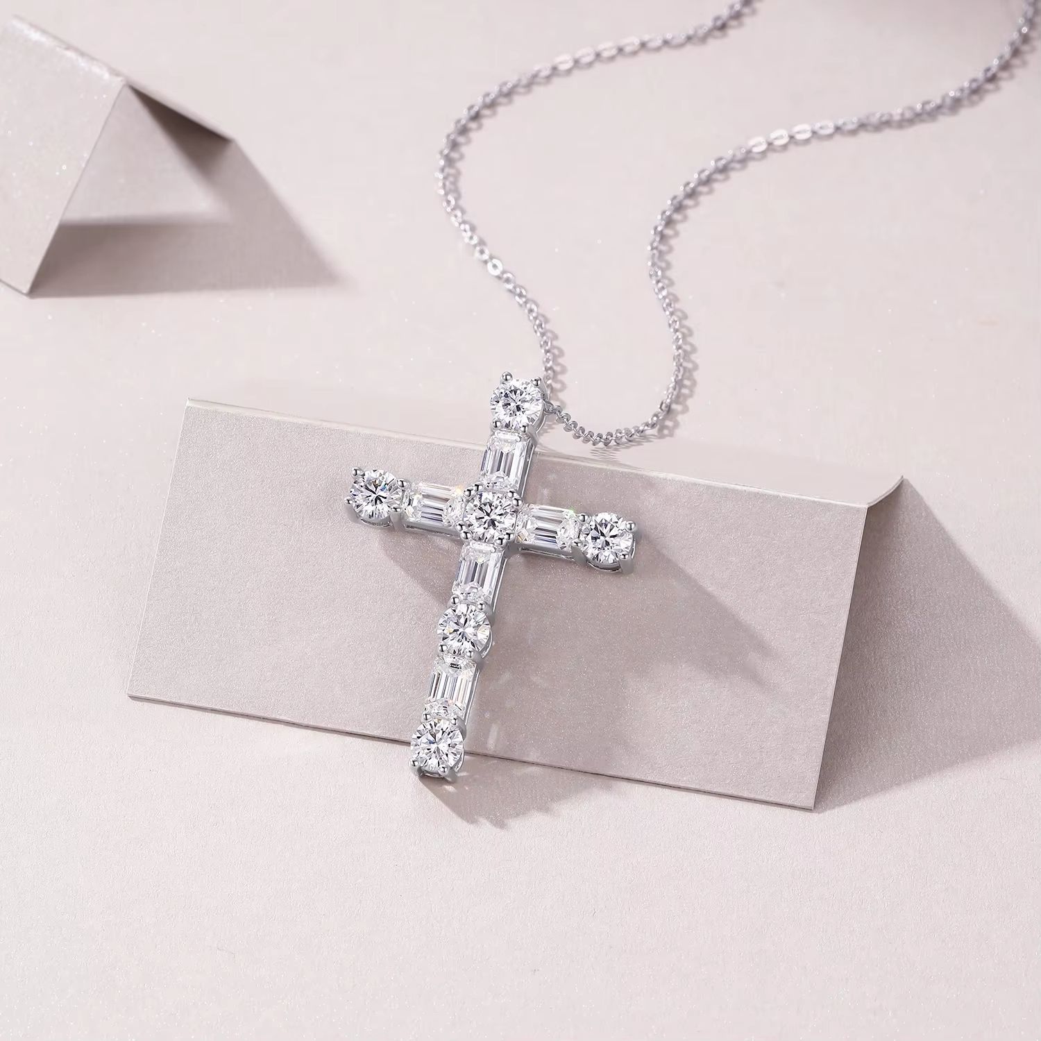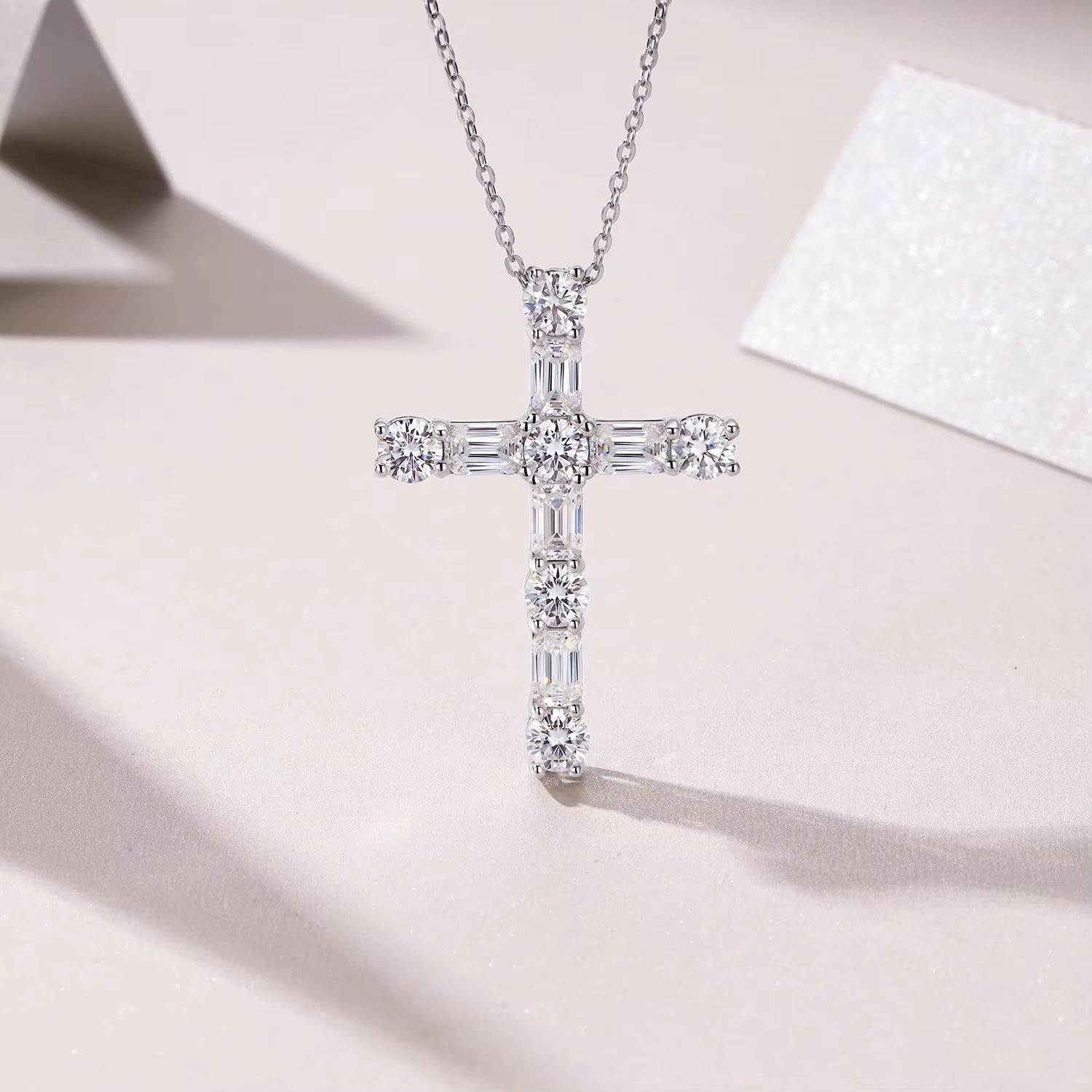 Cross Moissanite Pendant Necklace 925 Sterling Silver 18K Gold Plated Round and Baguette Moissanite with Certificate