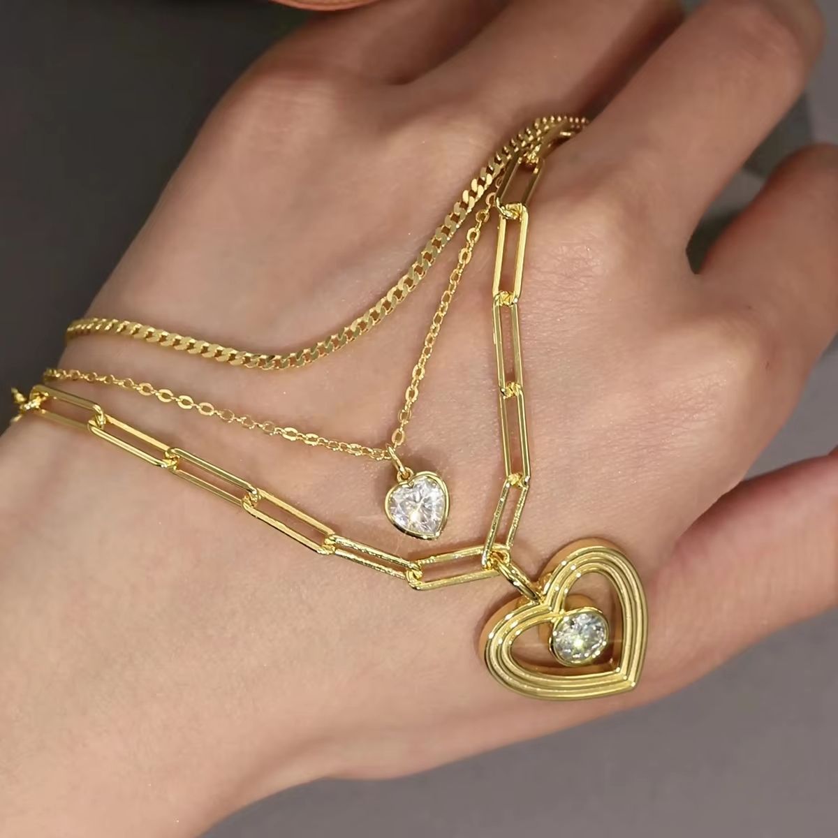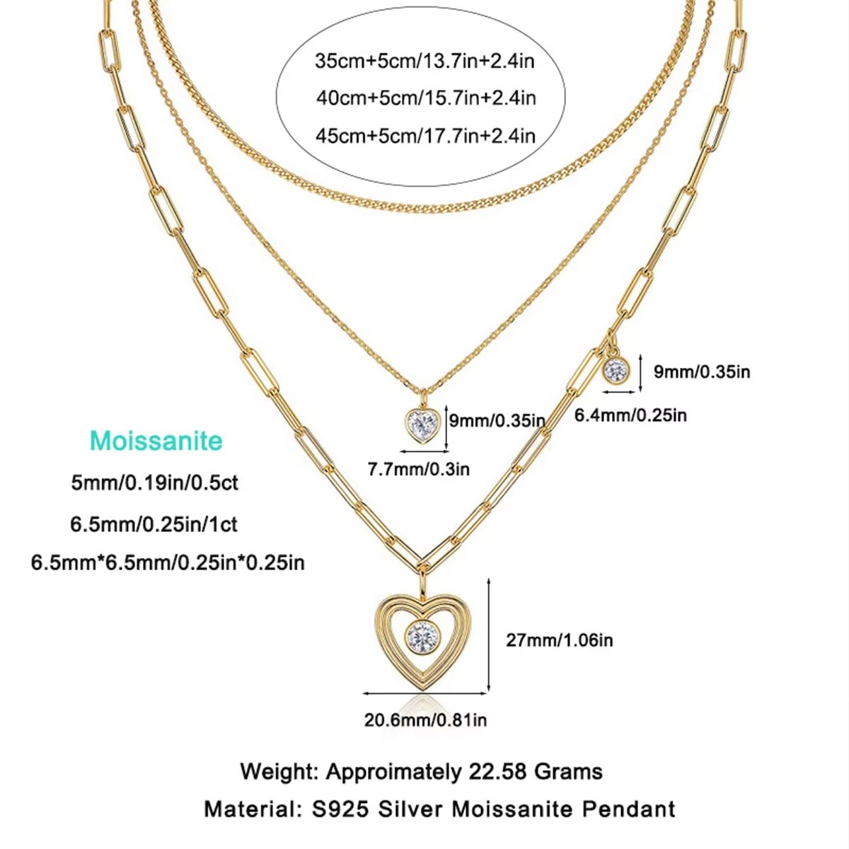 European Style Ins Heart Pendant 925 Silver Sweater Chain Gold Back Multiple Women's Moissanite Stack Wear Necklace