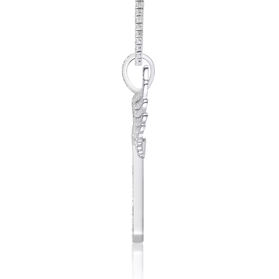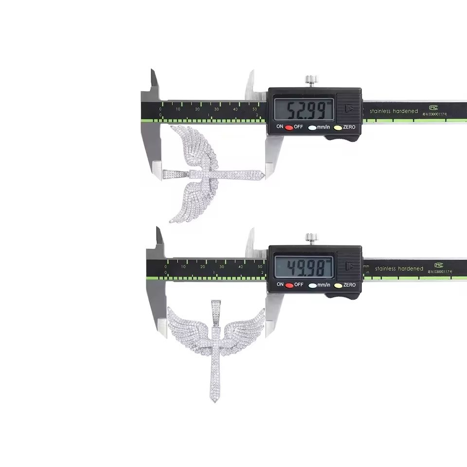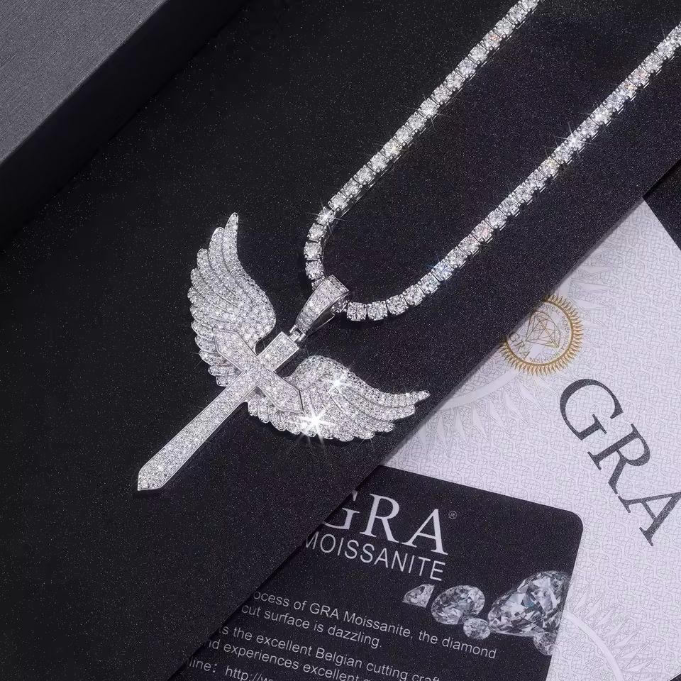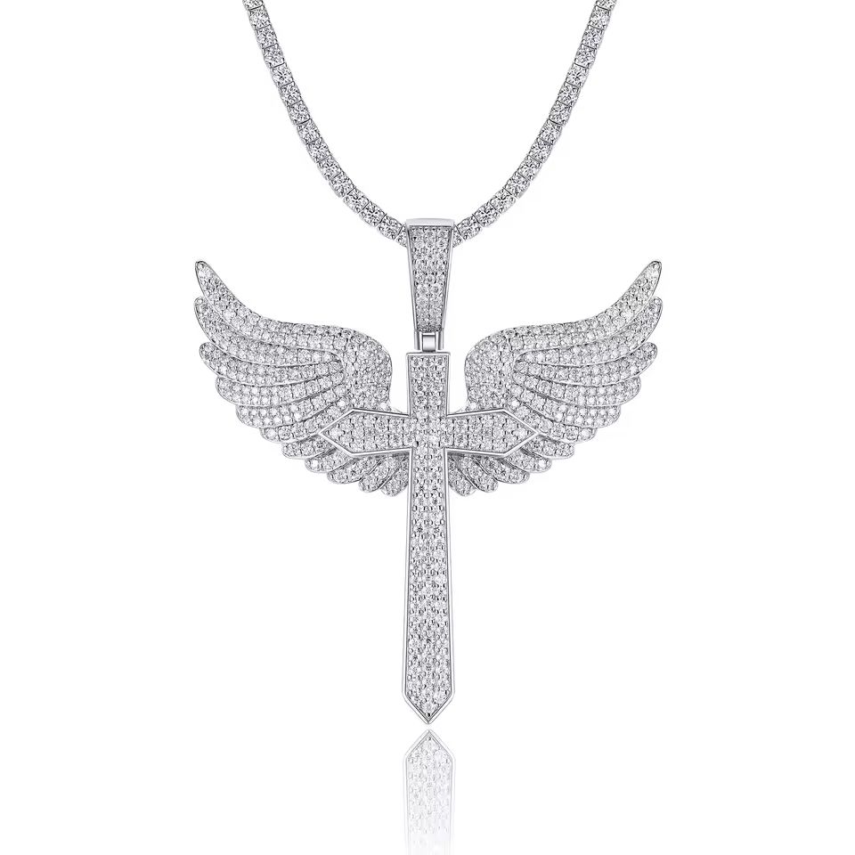 Halloween Gothic Cross & Angel Wings Necklace 925 Silver with Full Moissanite Sparkles for Dark Elegant