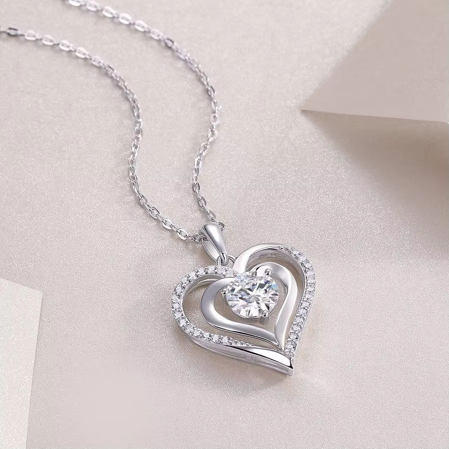 Hot Sale 925 Sterling Silver Moissanite Heart Pendant Necklace with Micro Pave Diamond Test Silver Chain for Women