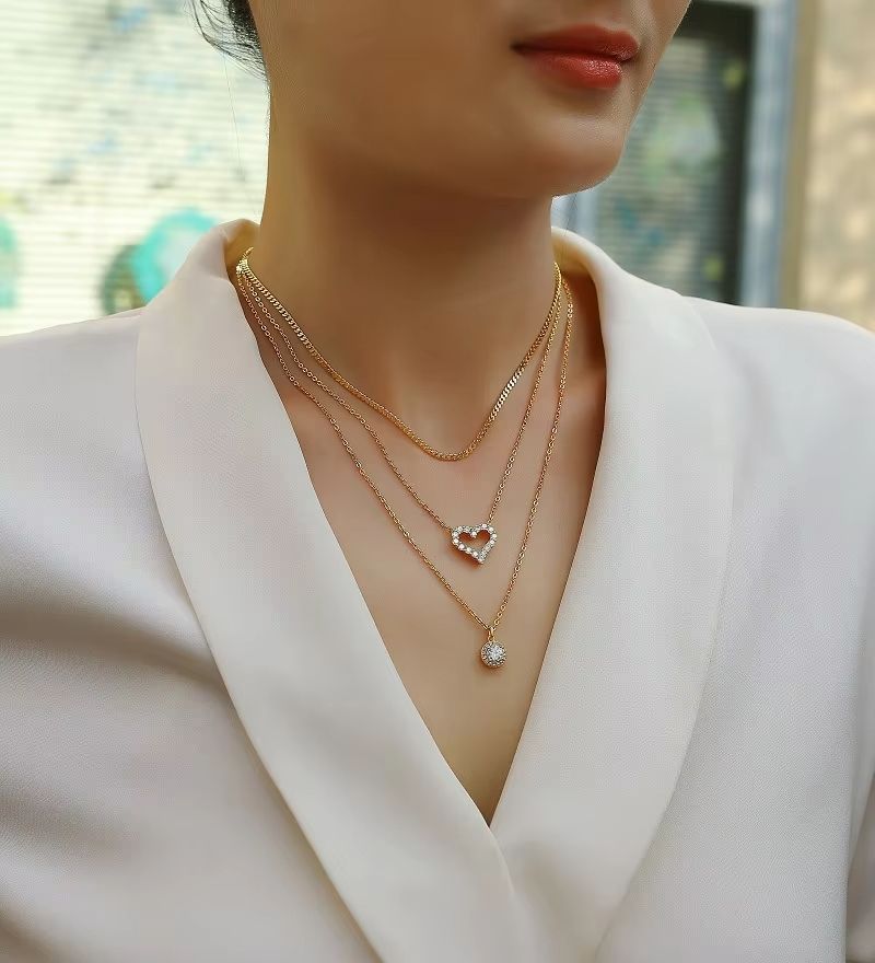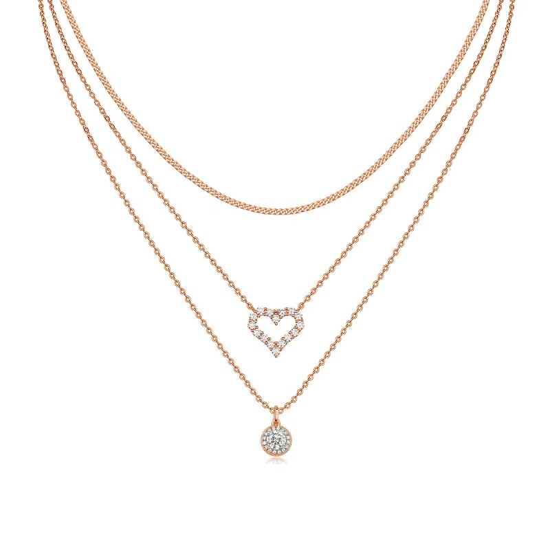 Moissanite Layered Necklace Heart Pendant Design 18K Gold Plated 925 Sterling Silver Three Chains Rose Gold