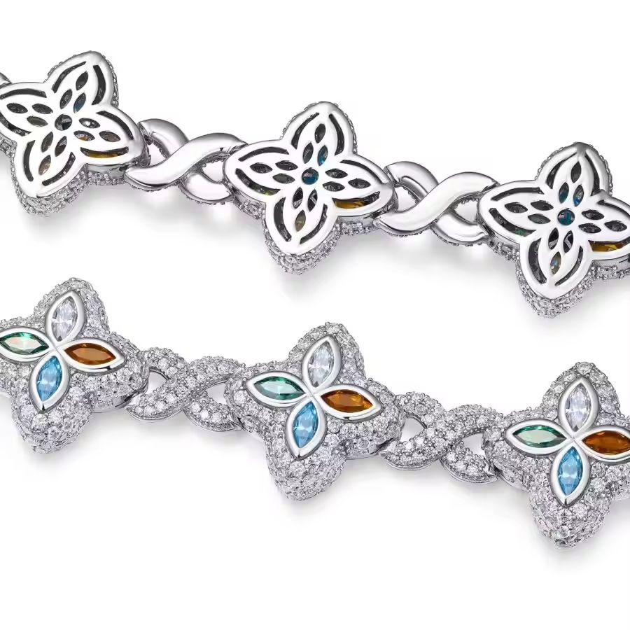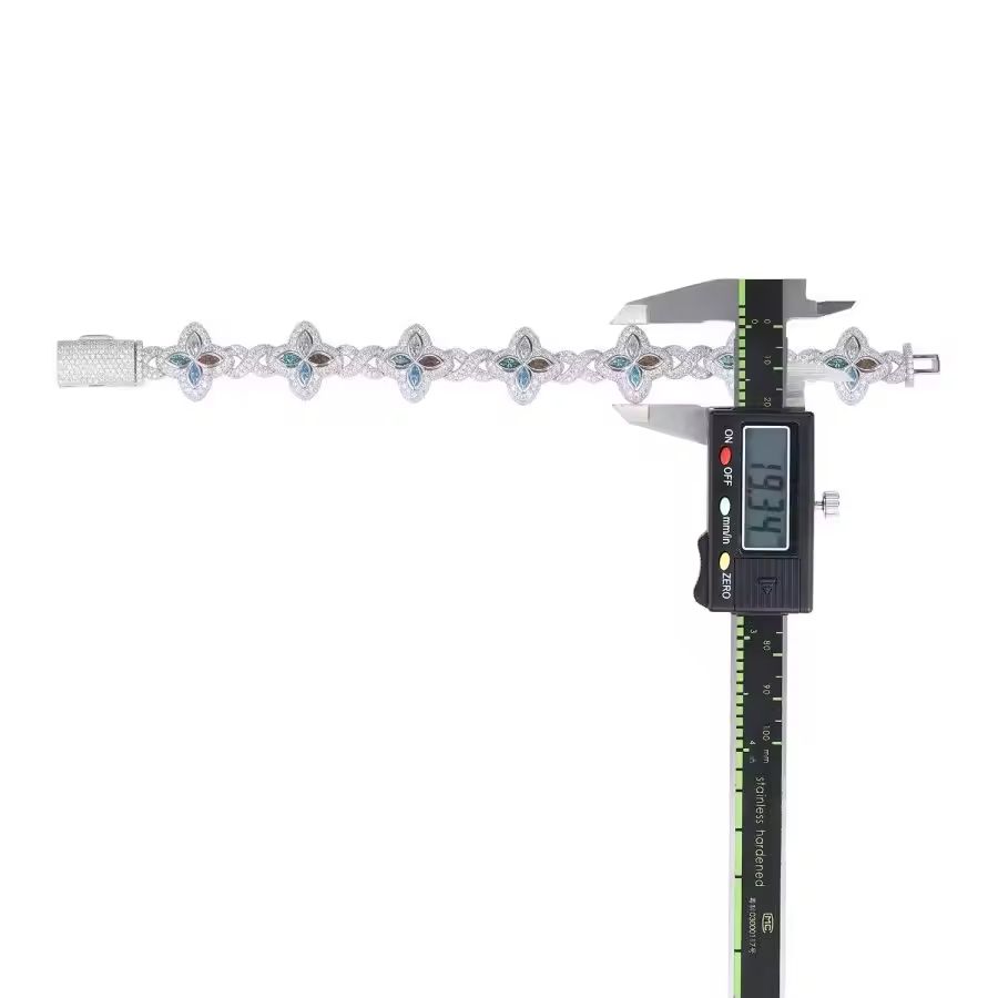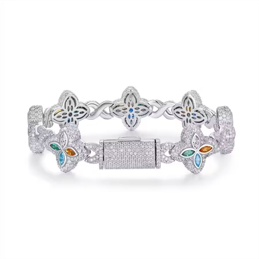 Unisex Fashionable 925 Silver Chain Bracelet with Moissanite & Four-Leaf Clover Design Stylish Hip Hop Gift for Birthdays